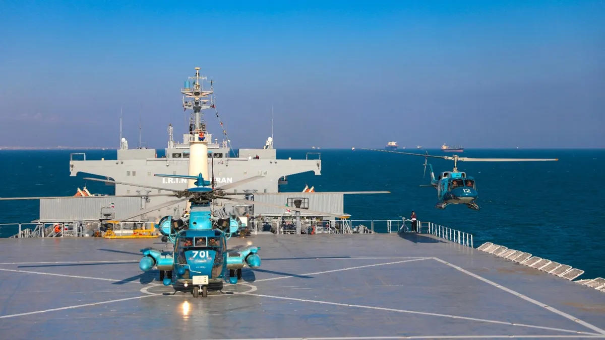طائرتان هليكوبتر فوق سطح سفينة "مكران" الحربية التابعة للبحرية الإيرانية خلال إبحارها في خليج عمان. 7 نوفمبر 2020 - AFP