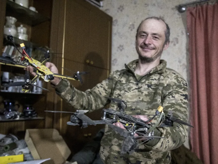 جندي أوكراني يحمل مسيرات تجارية معدلة، كوستيانتينيفكا، أوكرانيا. 5 مارس 2024 - AFP