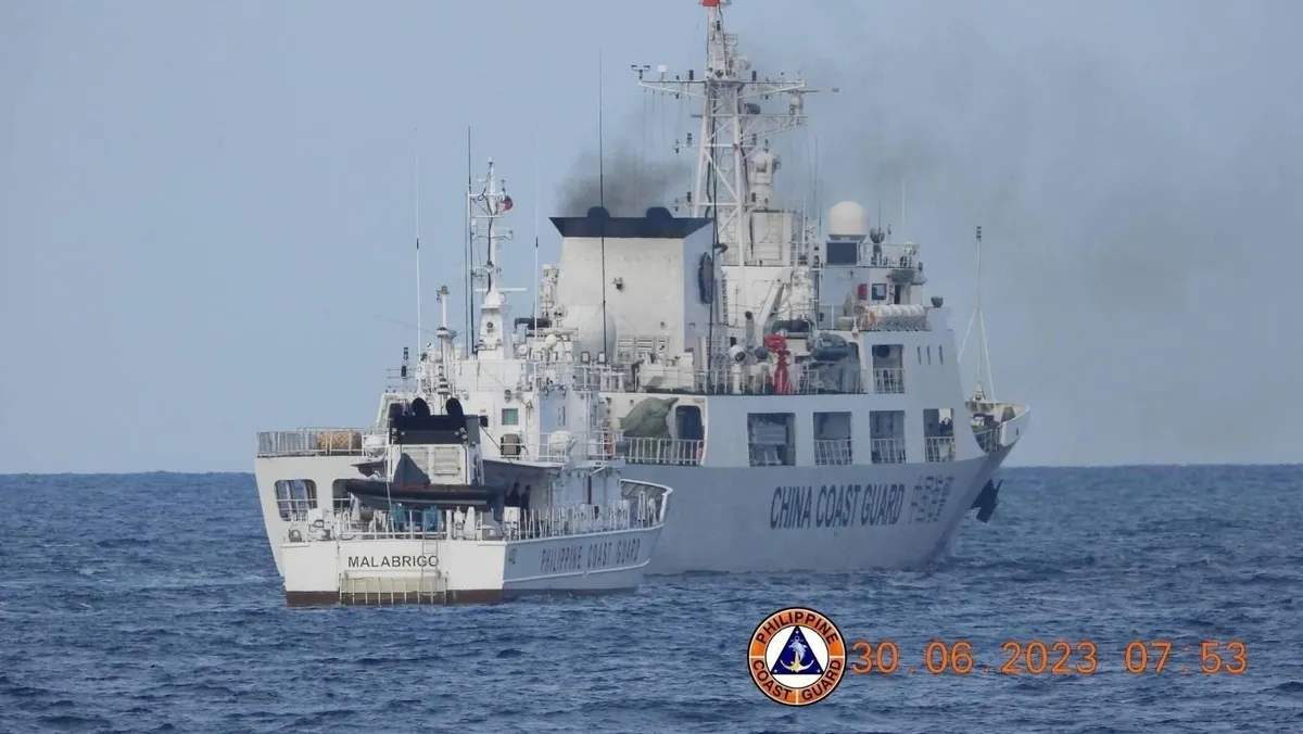 سفينة لخفر السواحل الصيني تعرقل سفينة تابعة لخفر السواحل الفلبيني في بحر الصين الجنوبي. 30 يونيو 2023  - REUTERS