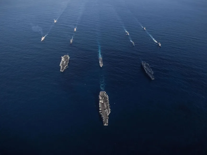 مجموعة سفن بينها حاملة الطائرات "يو إس إس رونالد ريجان" الأميركية وسفن من قوة الدفاع الذاتي التابعة للبحرية اليابانية في المياه الدولية غرب المحيط الهادئ. 12 نوفمبر 2017 - REUTERS