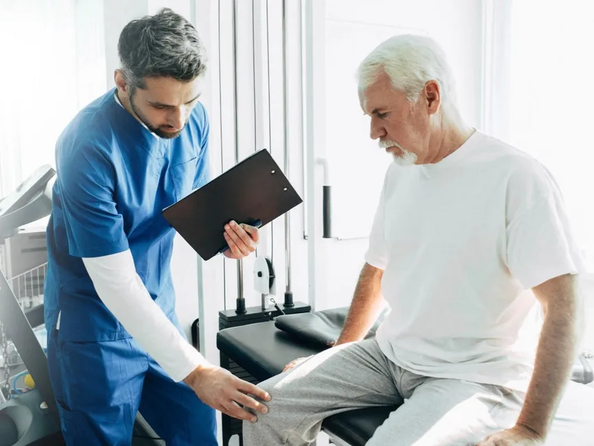 أخصائي علاج طبيعي يفحص مفصل ركبة مريض. 2 فبراير 2022 - AFP