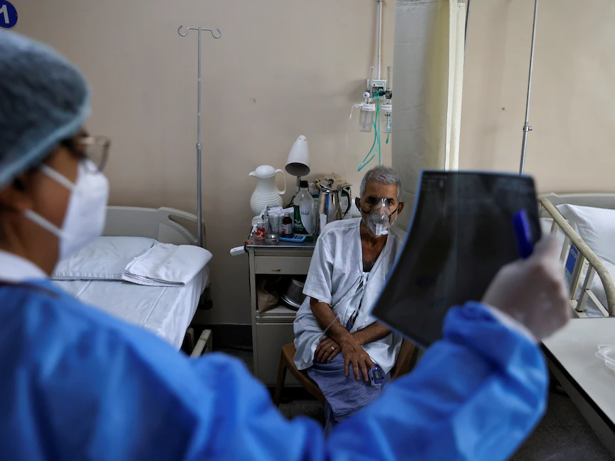 طبيبة تفحص صورة بالأشعة السينية لمريض مصاب بفيروس كورونا داخل مستشفى في نيودلهي، الهند- 1 مايو 2021 - REUTERS
