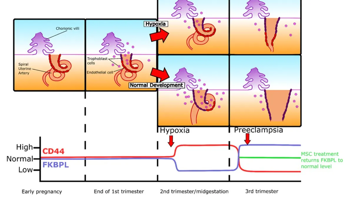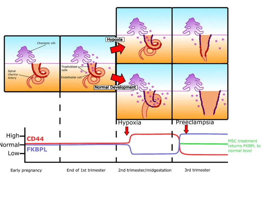 مخطط توضيحي لملخص التغييرات في جينات FKBPL وCD44 طوال فترة الحمل خلال حدوث مقدمات الارتعاج. - Oxford Press