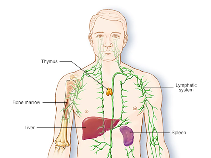 يشمل الجهاز اللمفاوي الغدد اللمفاوية، والطحال، والغدة الزعترية، ونخاع العظم، وقد تؤثر الإصابة بسرطان الغدد اللمفاوية على تلك الأجزاء جميعها، وكذلك الأجهزة الأخرى في جميع أنحاء الجسم.
