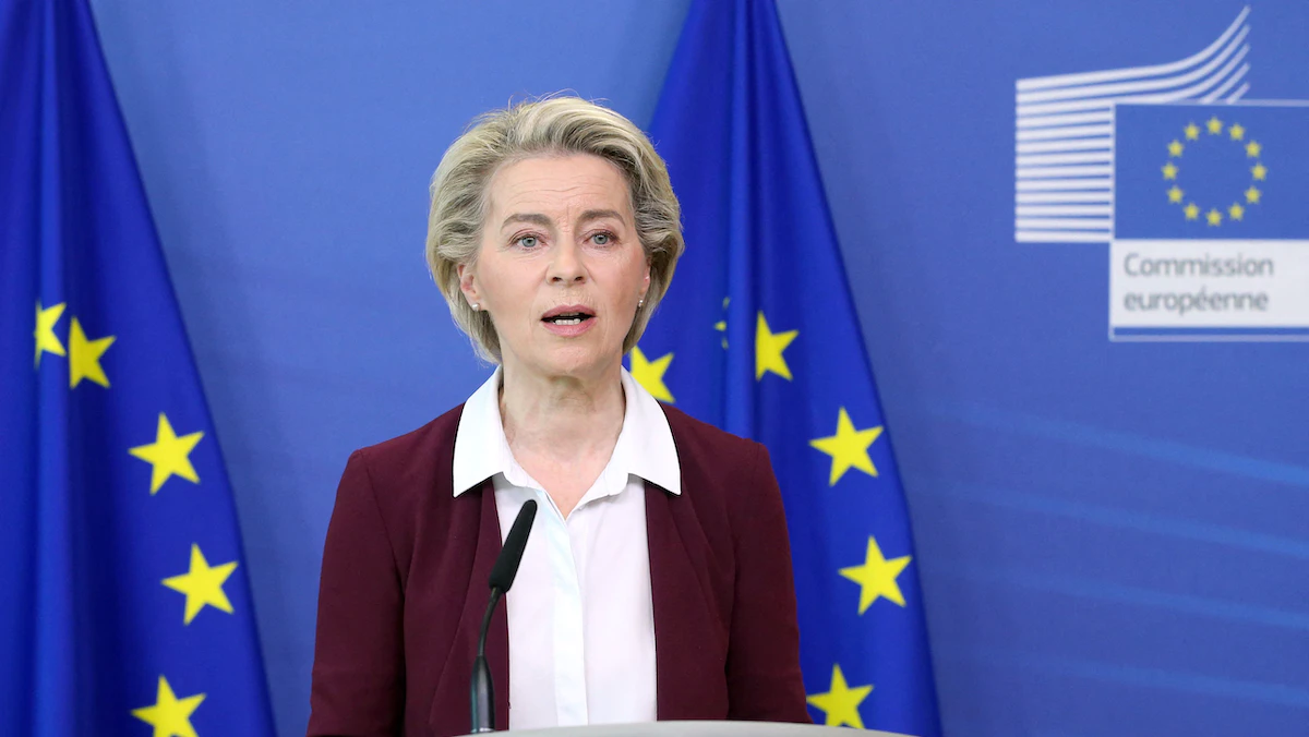 رئيسة المفوضية الأوروبية أورسولا فون دير لاين تتحدث خلال مؤتمر صحافي بمقر الاتحاد الأوروبي في بروكسل - 10 يوليو 2021 - AFP