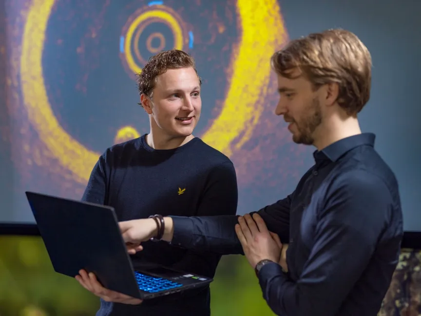 الطبيب الهولندي جوس ثانهاوزر (يسار) يعرض صورة للتصوير المقطعي البصري لجدران الشرايين التاجية، المركز الطبي بجامعة رادبود، هولندا - radboudumc.nl