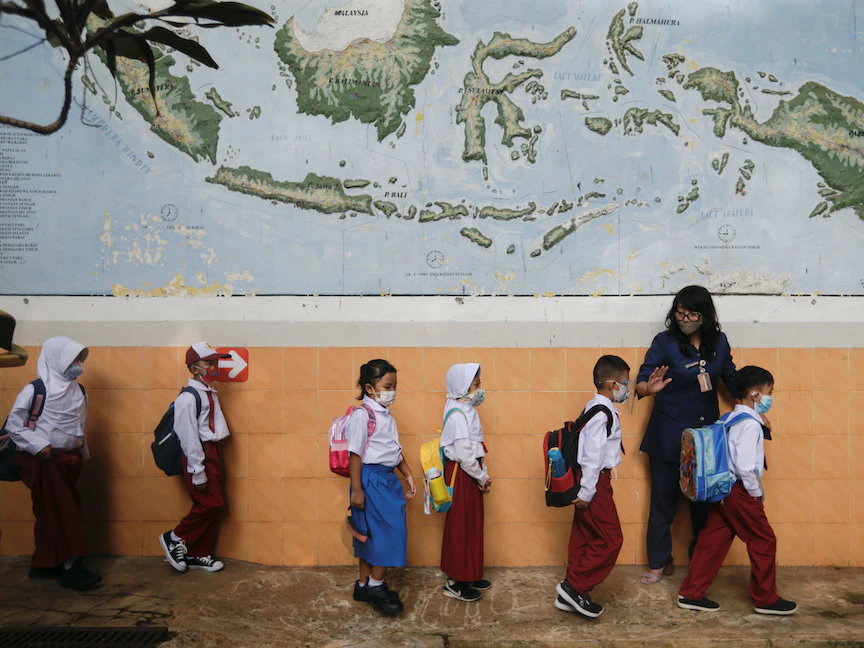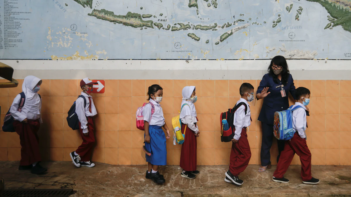 طلاب مدرسة ابتدائية يرتدون أقنعة الوجه مع إعادة فتح المدارس في جاكرتا - 30 أغسطس 2021 - REUTERS