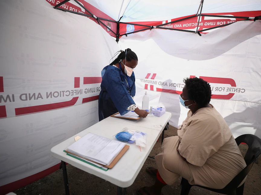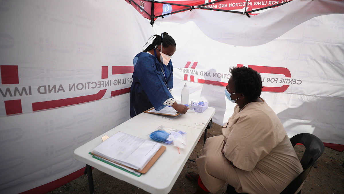 تخضع جلاديس رارا للفحص قبل اختبارها للكشف عن مرض السل في عيادة متنقلة في بلدة جوجوليثو بالقرب من كيب تاون، جنوب إفريقيا، 26 مارس 2021. - REUTERS