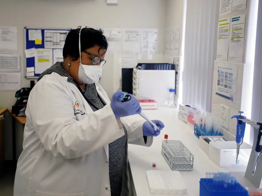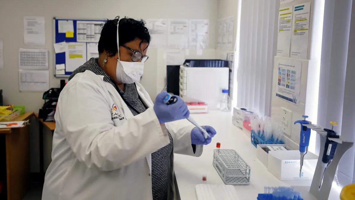 باحثة طبية تفحص عينات اختبار لقاح لمرض السل داخل مختبر في كيب تاون بجنوب إفريقيا. 11 مايو 2020 - Reuters
