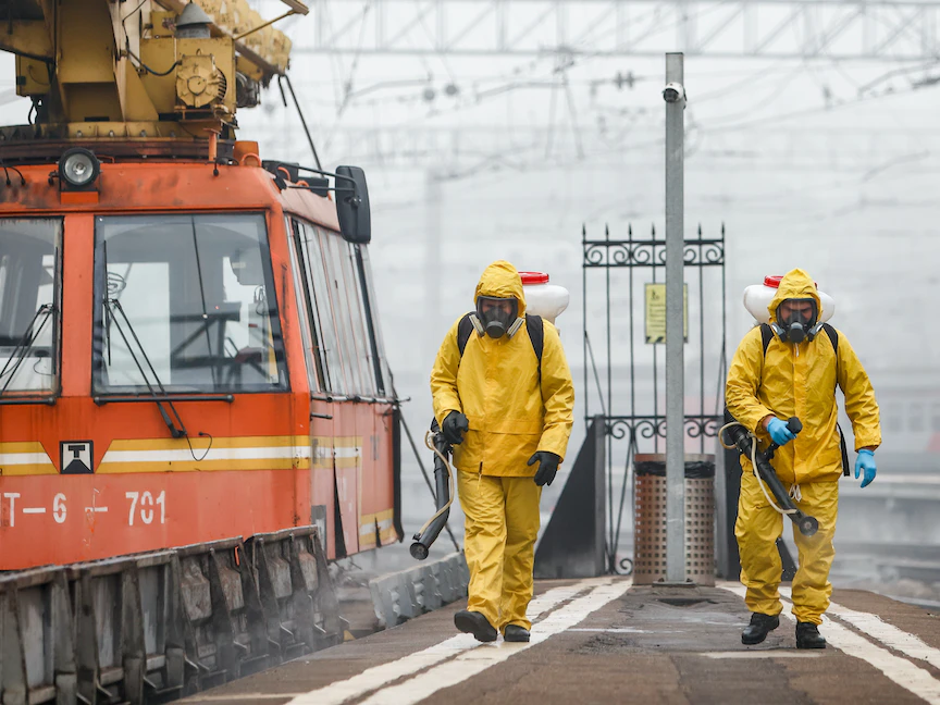 عاملان يرتديان معدات الحماية أثناء تعقيم محطة كازانسكي في العاصمة الروسية موسكو وسط تفشي كورونا - 2 نوفمبر 2021 - REUTERS