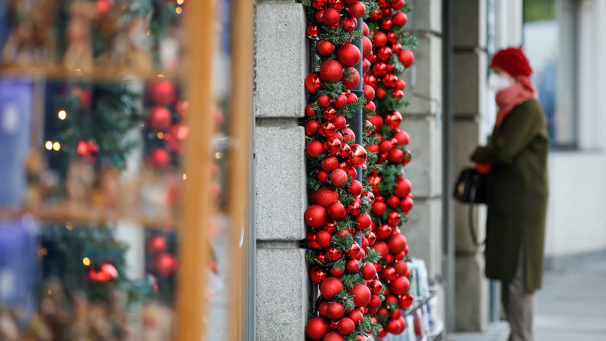 ألمانية ترتدي كمامة وتتطلع على واجهة إحدى المحال المزينة باحتفالات أعياد الميلاد في مدينة ميونخ - REUTERS