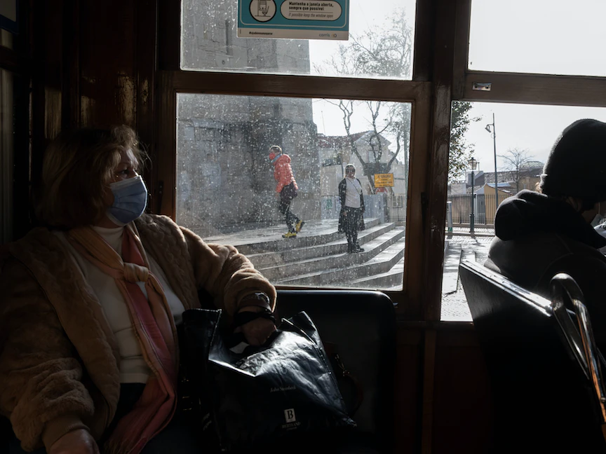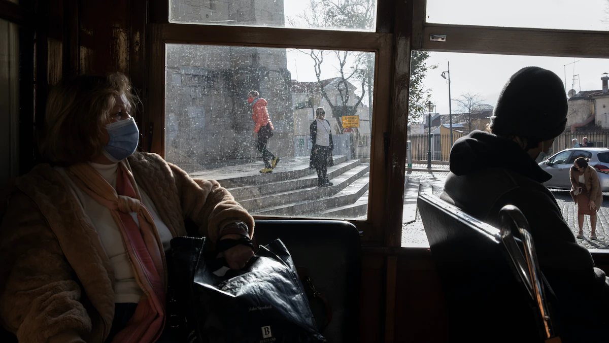 سيدة ترتدي كمامة للوقاية من فيروس كورونا داخل مواصلات عامة في لشبونة، البرتغال - Bloomberg