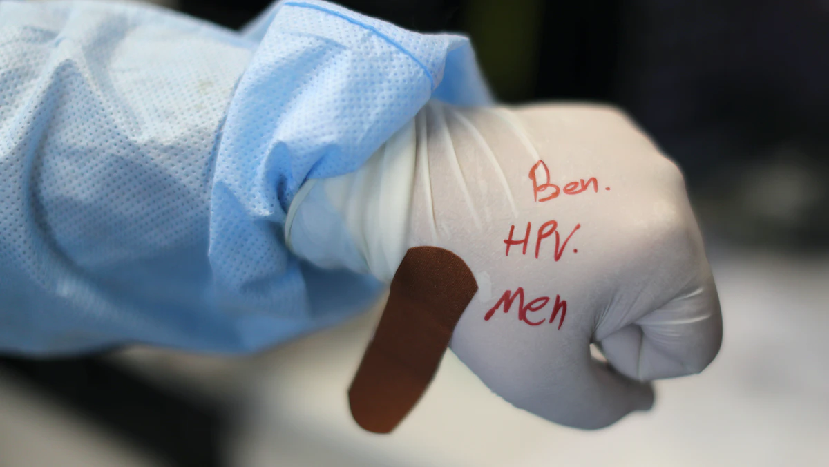 عامل صحي يدوين ملاحظة على قفازته لإعطاء لقاح التهاب الكبد، وفيروس الورم الحليمي البشري، والتهاب السحايا في عيادة  في وستمنستر ، كاليفورنيا ، الولايات المتحدة. 19 أغسطس 2021 - REUTERS