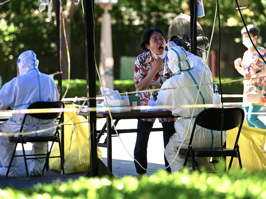 عامل صحي (يمين) يأخذ عينة من امرأة لفحصها للكشف عن فيروس كورونا Covid-19 في بكين- 5 يونيو 2022 - AFP