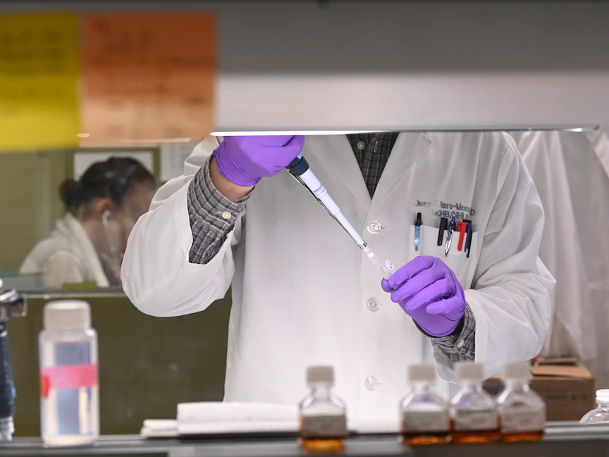 عامل مختبر وبيده عينات يفحصها - REUTERS