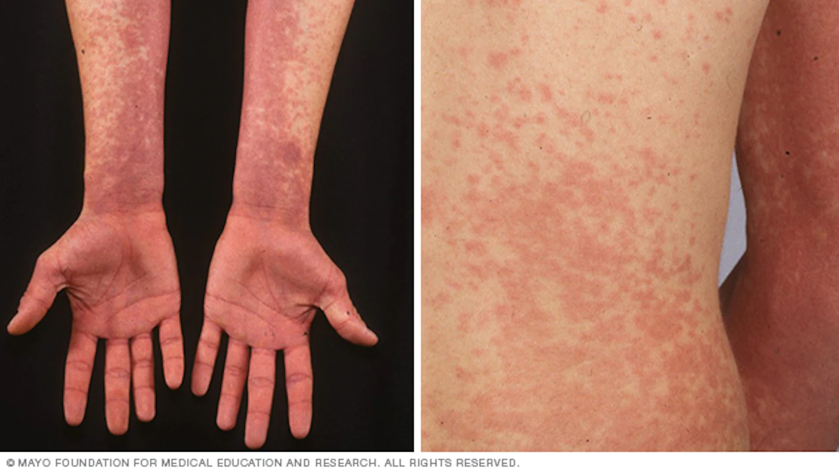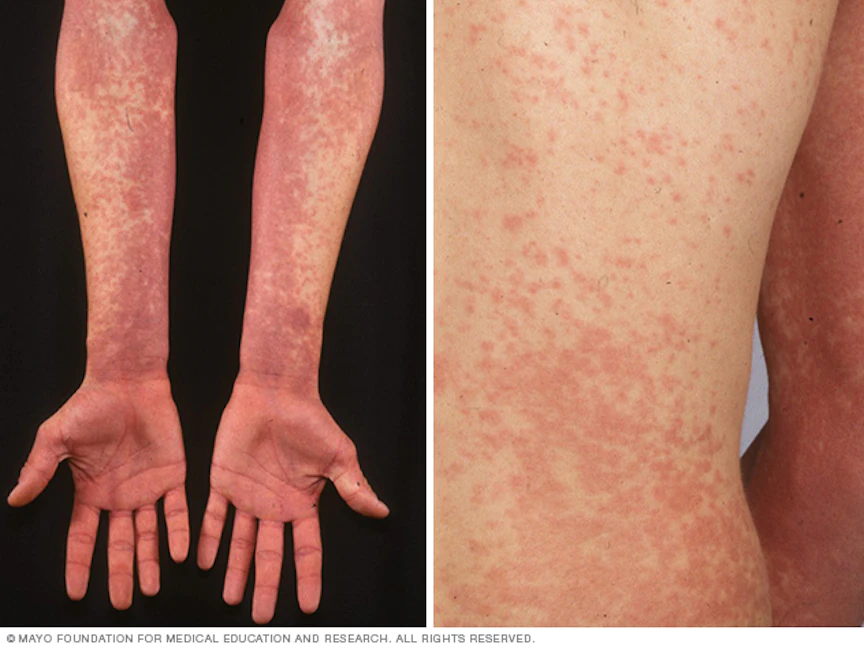 - طفح جلدي أحمر.