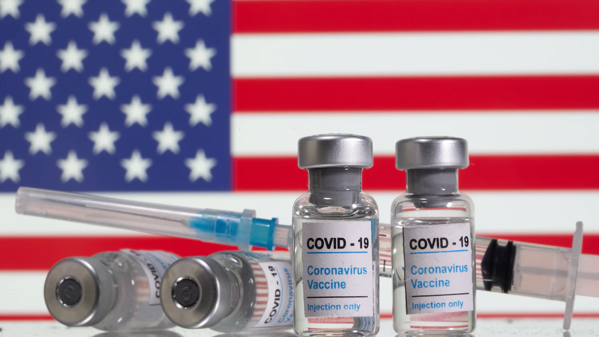 صورة رمزية تُظهر زجاجات لقاح مضاد لكورونا وخلفها العلم الأميركي - REUTERS