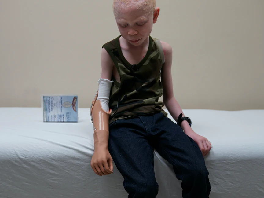 وغالباً ما تكون الرموش والحواجب شاحبة اللون، إذ قد يتغير لون العينين من الأزرق الخفيف جداً إلى اللون البني، كما قد يتغير اللون مع التقدم في العمر.