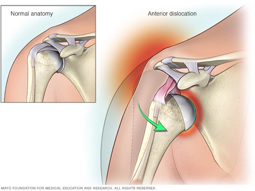 ويُعد مفصل الكتف أكثر المفاصل تعرضاً للخلع في الجسم، ويمكن أن يُخلع الكتف للأمام أو للخلف أو للأسفل، وبشكل كلي أو جزئي، نتيجة لتحركه في اتجاهات متعددة، ومع ذلك تحدث معظم حالات الخلع عبر الجزء الأمامي من الكتف.