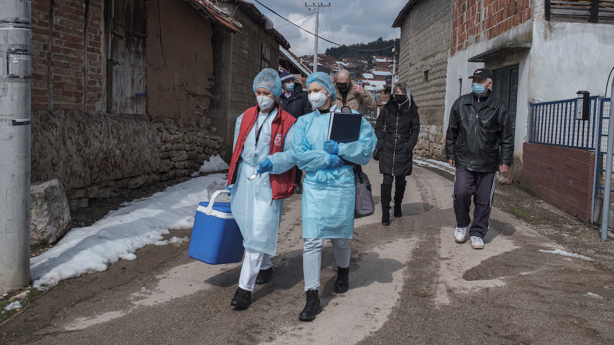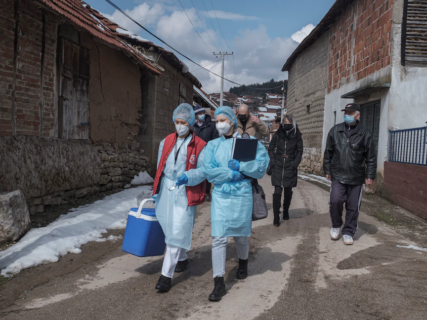 عاملون في القطاع الطبي خلال حملة التطعيم بلقاح كورونا في أحد أرياف صربيا- 19 مارس 2021 - REUTERS