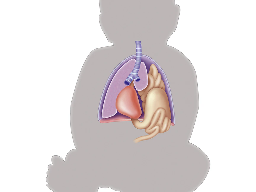 بالإضافة إلى ذلك، تتسم الرئة الموجودة في جانب الحجاب الحاجز الذي يوجد به الفتق بصغر الحجم، ويتأثر نمو الرئتين كلتيهما، فلا تتطور الأكياس الهوائية (الحويصلات الهوائية) داخل الرئتين كما ينبغي.