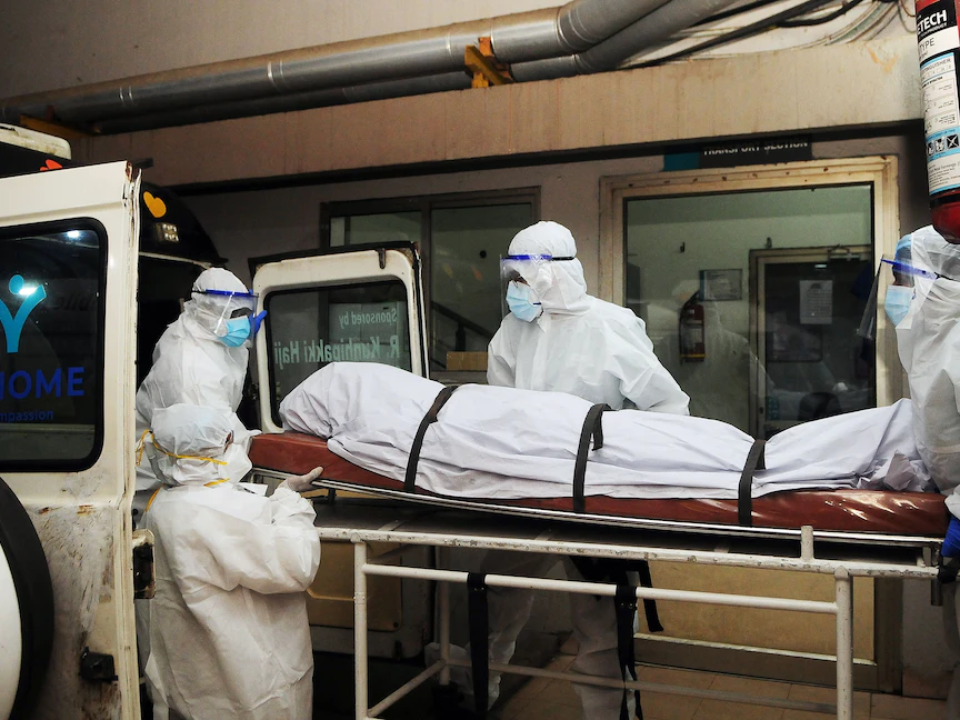 عاملون صحيون يرتدون ملابس واقية أثناء نقل جثة شخص توفي بعدوى فيروس نيباه في مستشفى في كوزيكود بولاية كيرالا الهندية. 12 سبتمبر 2023 - AFP