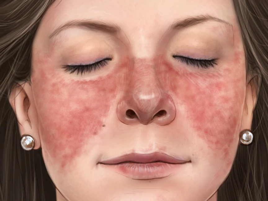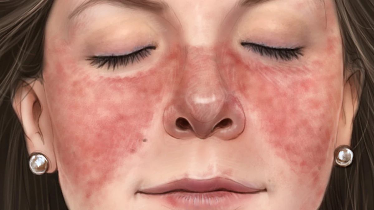 - طفح على شكل فراشة على الوجه يغطي الخدين وجسر الأنف.