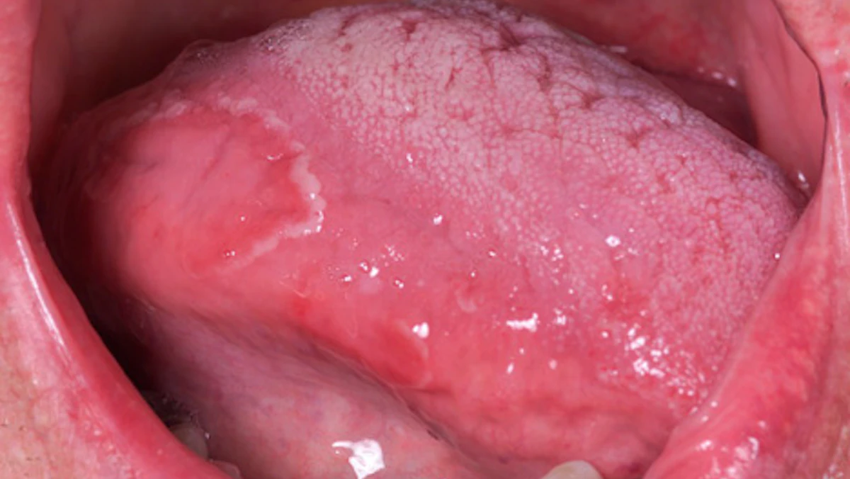 - بقع حمراء ملساء غير منتظمة الشكل على أعلى أو جانب اللسان.
