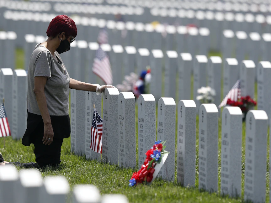 سيدة أميركية في إحدى مدافن ولاية أوهايو تقف أمام قبر زوجها الذي توفي جراء فيروس كورونا - 25 مايو 2020 - REUTERS