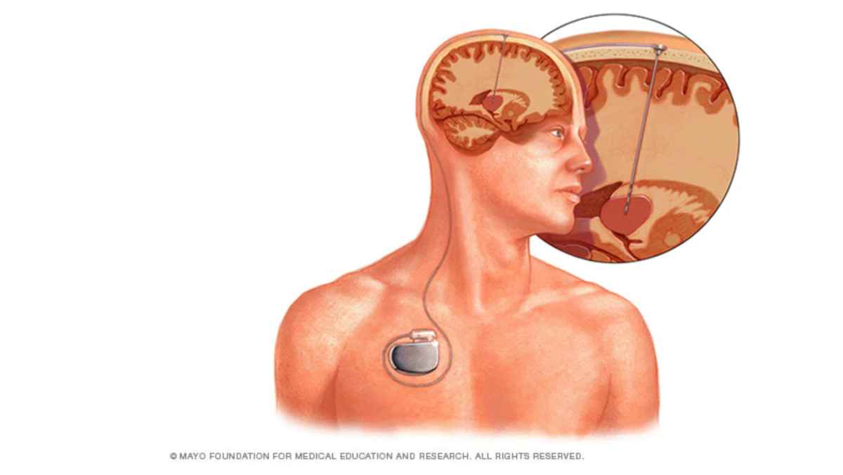 ينطوي التحفيز العميق للدماغ على زرع قطب كهربائي بصورة عميقة داخله يتم توصيله بالقلب - مايوكلينيك