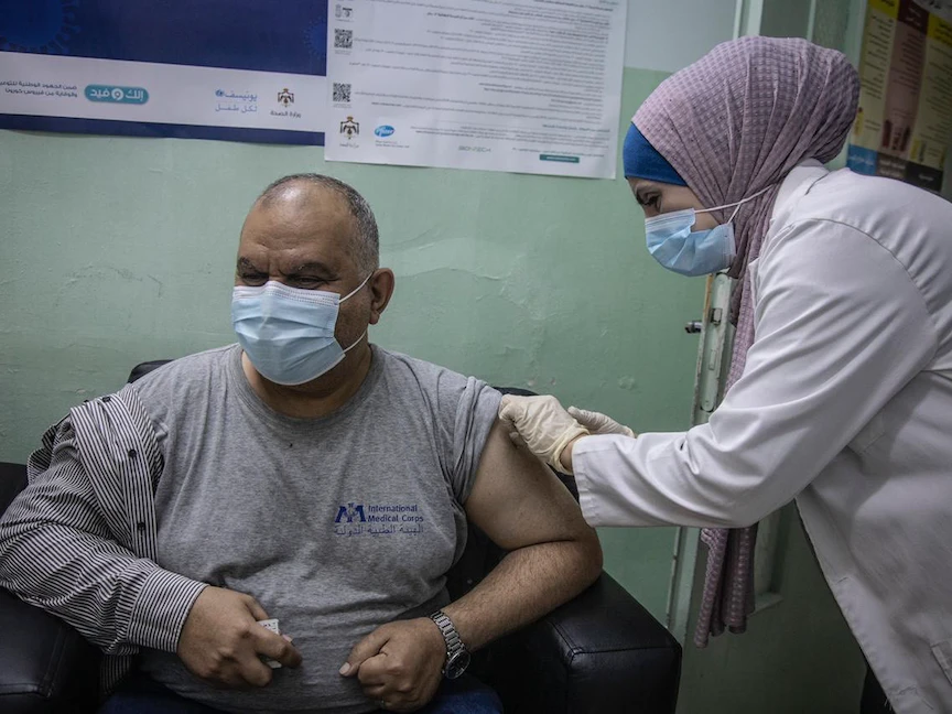 ويحق لأي شخص يعيش على الأراضي الأردنية، بما في ذلك اللاجئين وطالبو اللجوء، الحصول على اللقاح مجانًا.