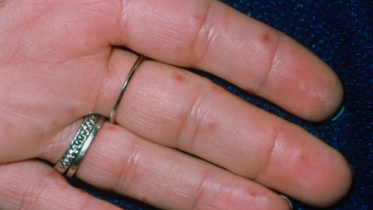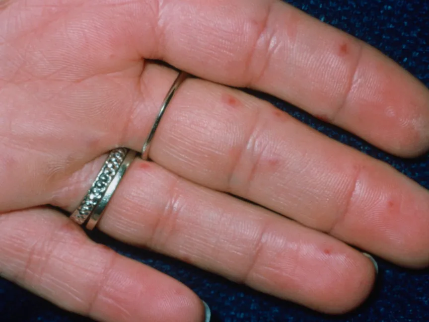 - ظهور مناطق صغيرة مثيرة للحكة على الجلد، وغالباً تكون في القدمين أو اليدين.