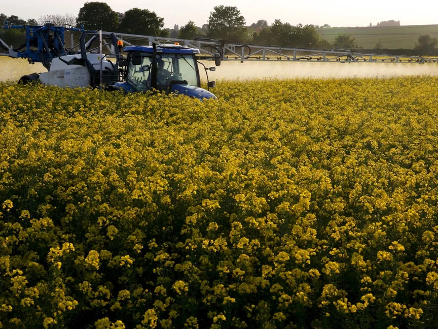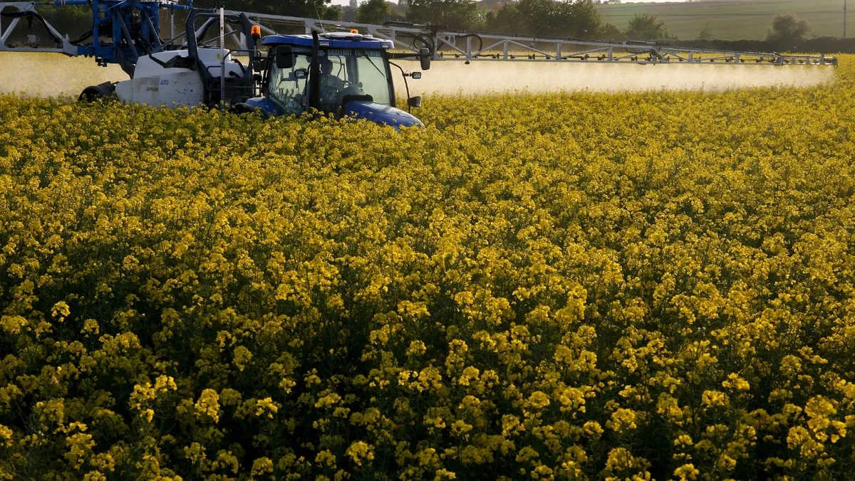 مزارع يرش حقل لفت بالمبيدات الحشرية ومبيدات الفطريات في بليكور بالقرب من كامبراي في فرنسا. 10 مايو 2015 - Reuters