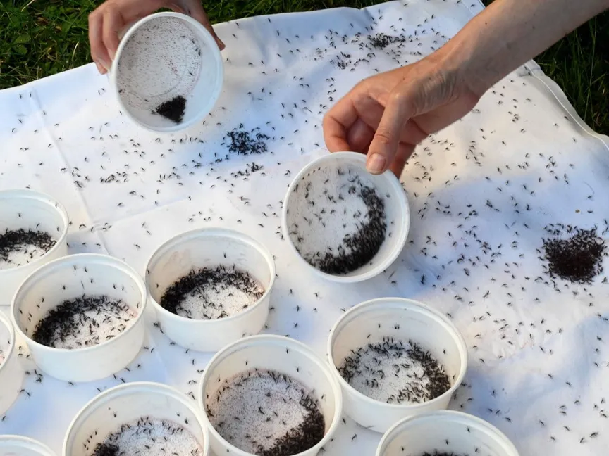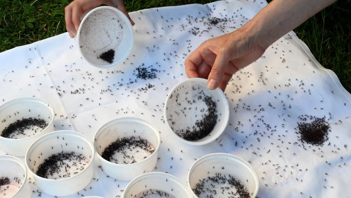 حاويات بلاستيكية بها بعوض معقم قبل إطلاقه في زغرب في محاولة لمحاربة البعوض الحامل للأمراض. 29 يونيو 2023 - AFP