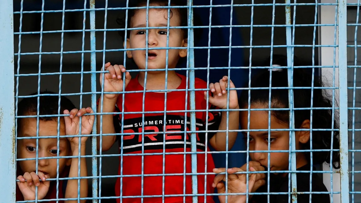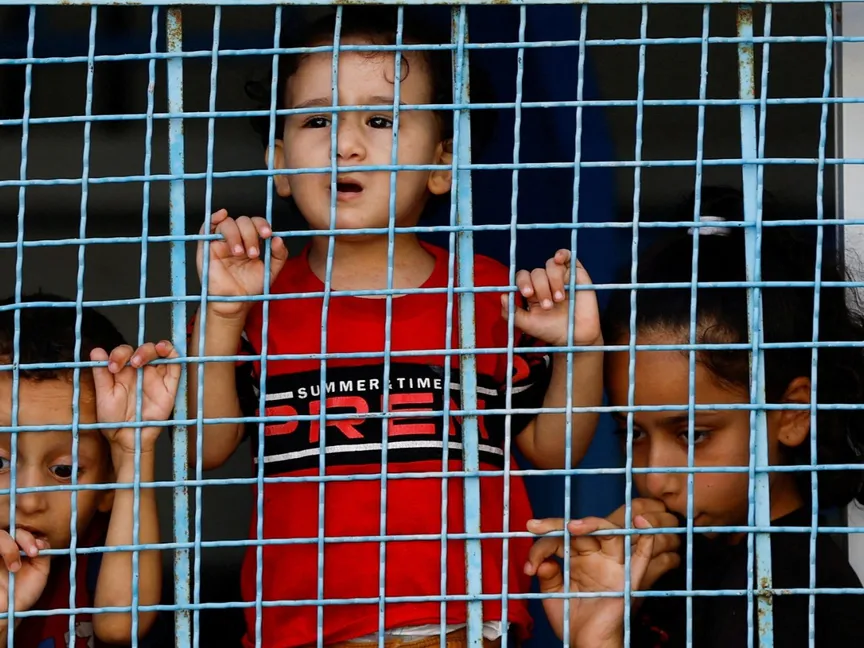 أطفال فلسطينيون في مخيم للاجئين تشرف عليه الأمم المتحدة بغرب خان يونس في قطاع غزة. 18 أكتوبر 2023 - Reuters