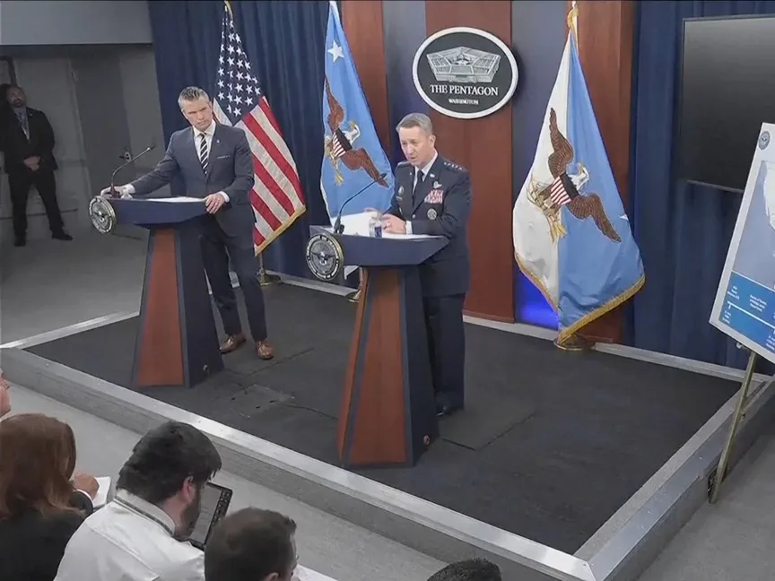 وزير الدفاع الأميركي بيت هيجسيث ورئيس هيئة الأركان المشتركة الجنرال دان كين خلال مؤتمر صحافي في مقر البنتاجون. 22 يونيو 2025 - Reuters