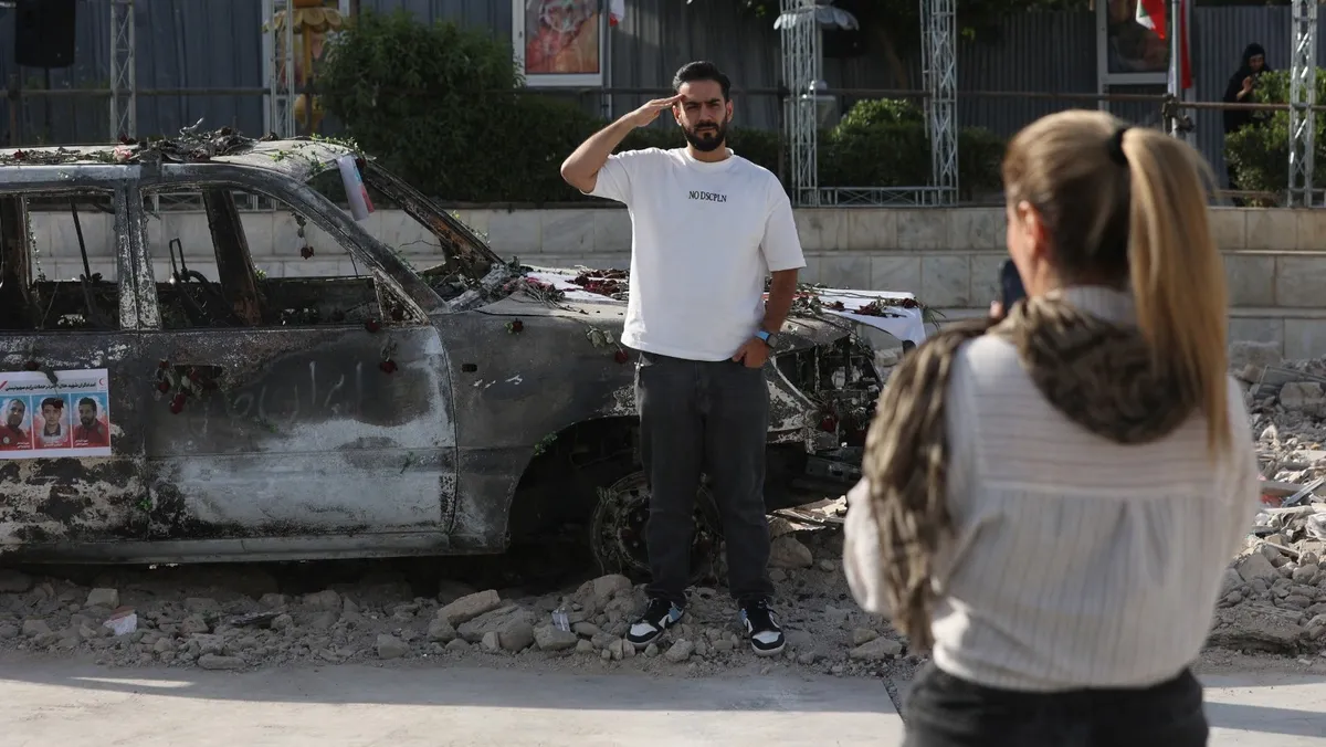 رجل يقف لالتقاط صورة بجوار سيارة إسعاف محترقة بأحد شوارع العاصمة طهران. 23 يونيو 2025 - REUTERS