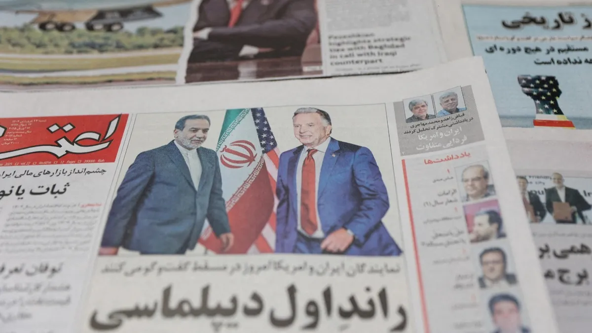 صحيفة إيرانية بغلاف يحمل صورة وزير الخارجية الإيراني عباس عراقجي والمبعوث الأميركي إلى الشرق الأوسط ستيف ويتكوف. 12 أبريل 2025 - REUTERS