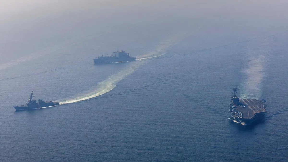 حاملة الطائرات الأميركية أبراهام لينكولن والمدمرة الصاروخية فرانك إي بيترسن جونيور وسفينة الشحن كارل براشير في بحر العرب. 6 فبراير 2026 - REUTERS