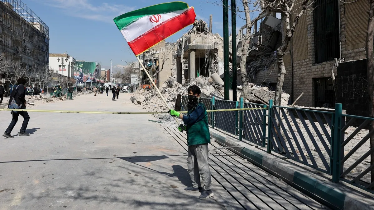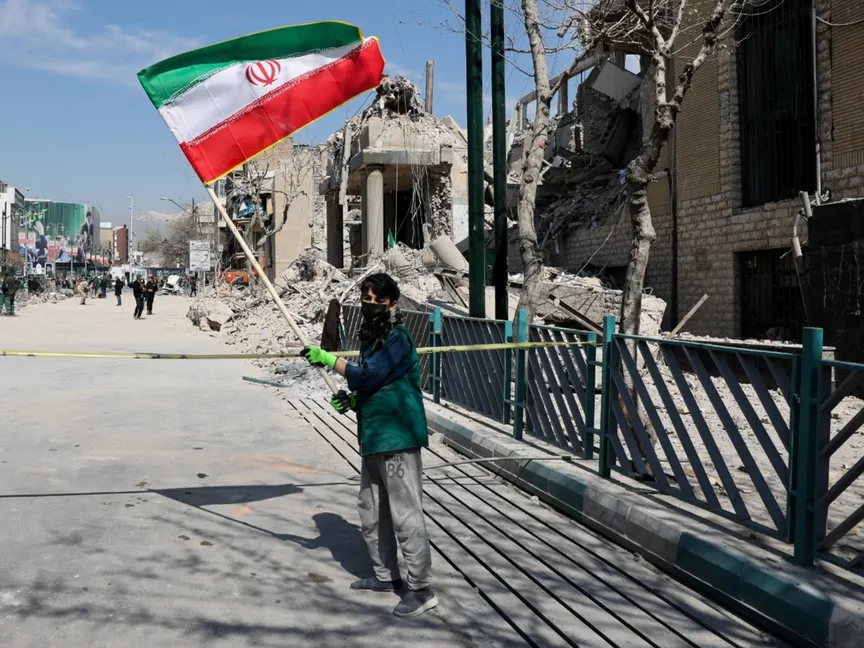 طفل يحمل العلم الإيراني أمام موقع تعرض لغارات جوية أميركية إسرائيلية في طهران. 4 مارس 2026 - Reuters