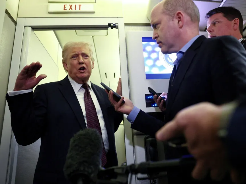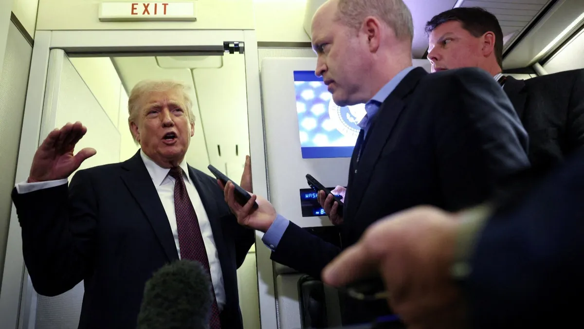 الرئيس الأميركي دونالد ترمب يتحدث إلى الصحافيين على متن الطائرة الرئاسية لدى عودته إلى واشنطن. 15 مارس 2026 - Reuters