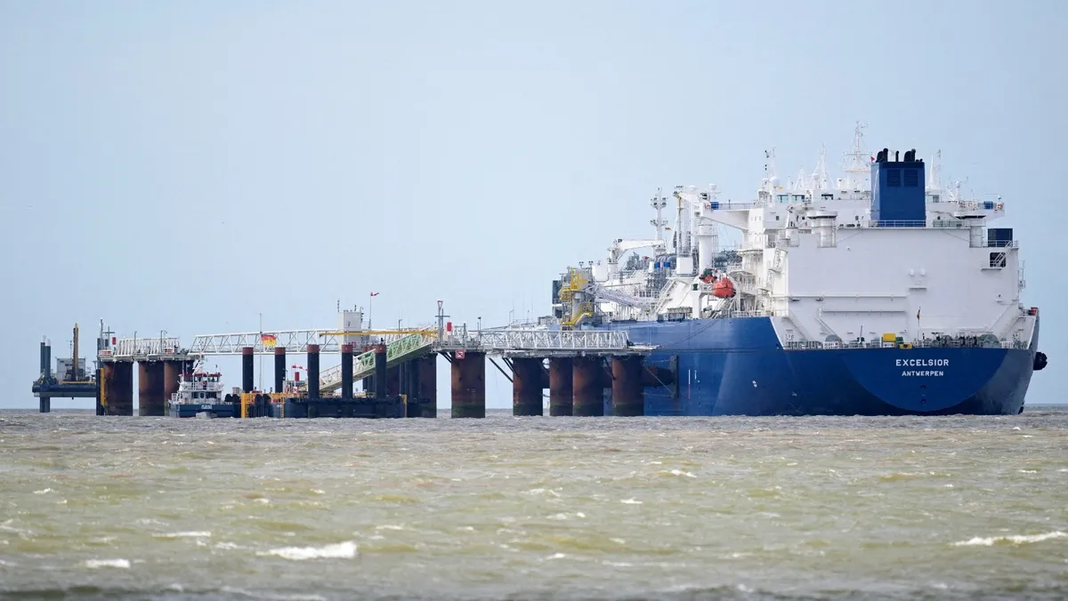سفينة "إكسلسيور" لإعادة تحويل الغاز الطبيعي المسال إلى غاز خلال افتتاح ثاني محطة غاز عائمة تابعة لـ"دويتشه إنرجي تيرمنال"، فيلهلمسهافن بألمانيا. 26 مايو 2025 - Reuters