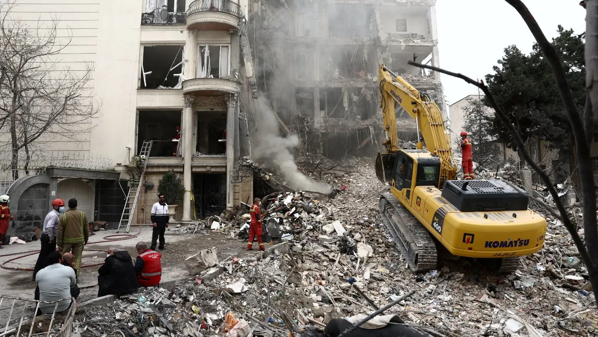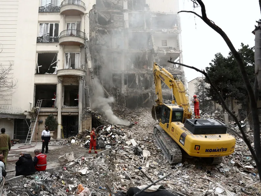 آليات ثقلية ترفع أنقاض مبنى سكني تضرر جراء القصف بالعاصمة الإيرانية طهران. 23 مارس 2026 - REUTERS