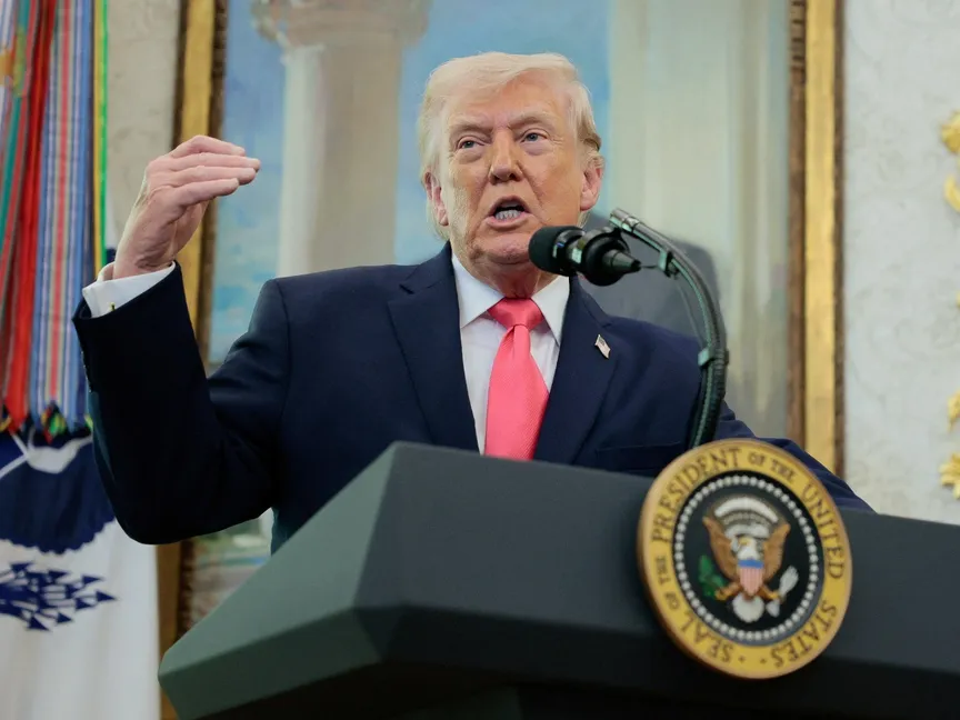 الرئيس الأميركي دونالد ترمب خلال كلمة في مراسم أداء ماركواين مولين اليمين الدستورية وزيراً للأمن الداخلي، البيت الأبيض، واشنطن. 24 مارس 2026 - REUTERS
