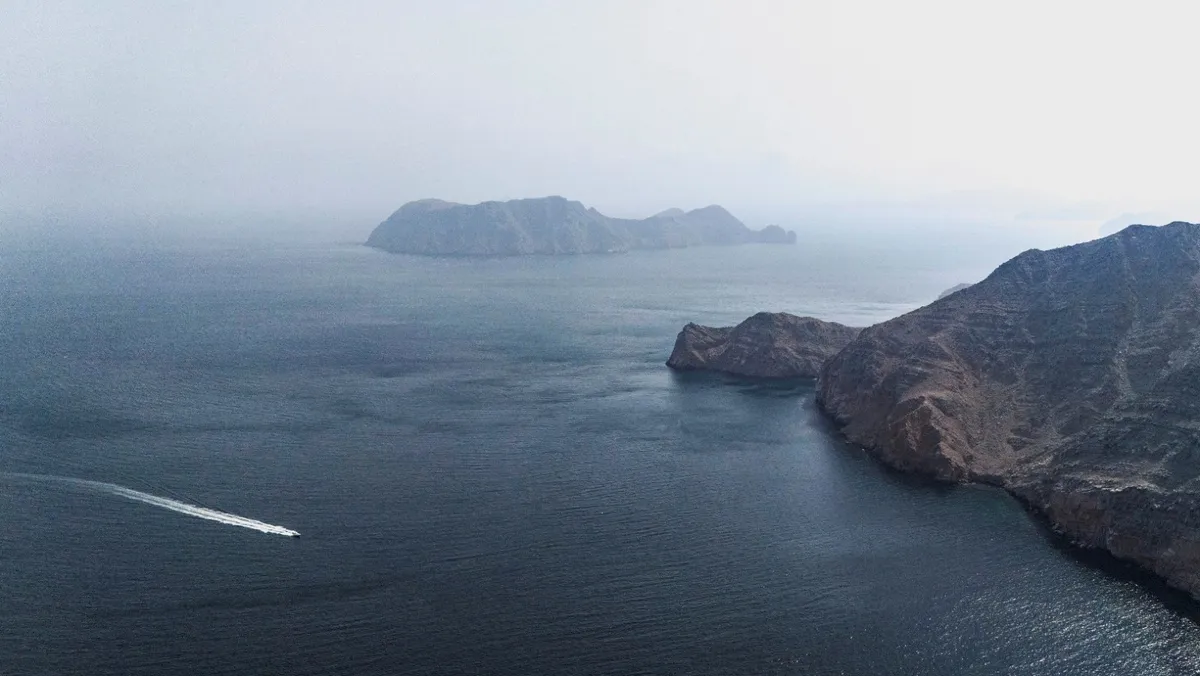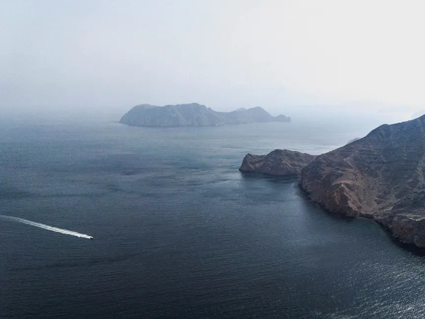 صورة بطائرة مسيرة تظهر قارباً يتحرك قرب قرية كمزار بمحافظة مسندم العمانية المطلة على مضيق هرمز. 27 أغسطس 2025 - REUTERS