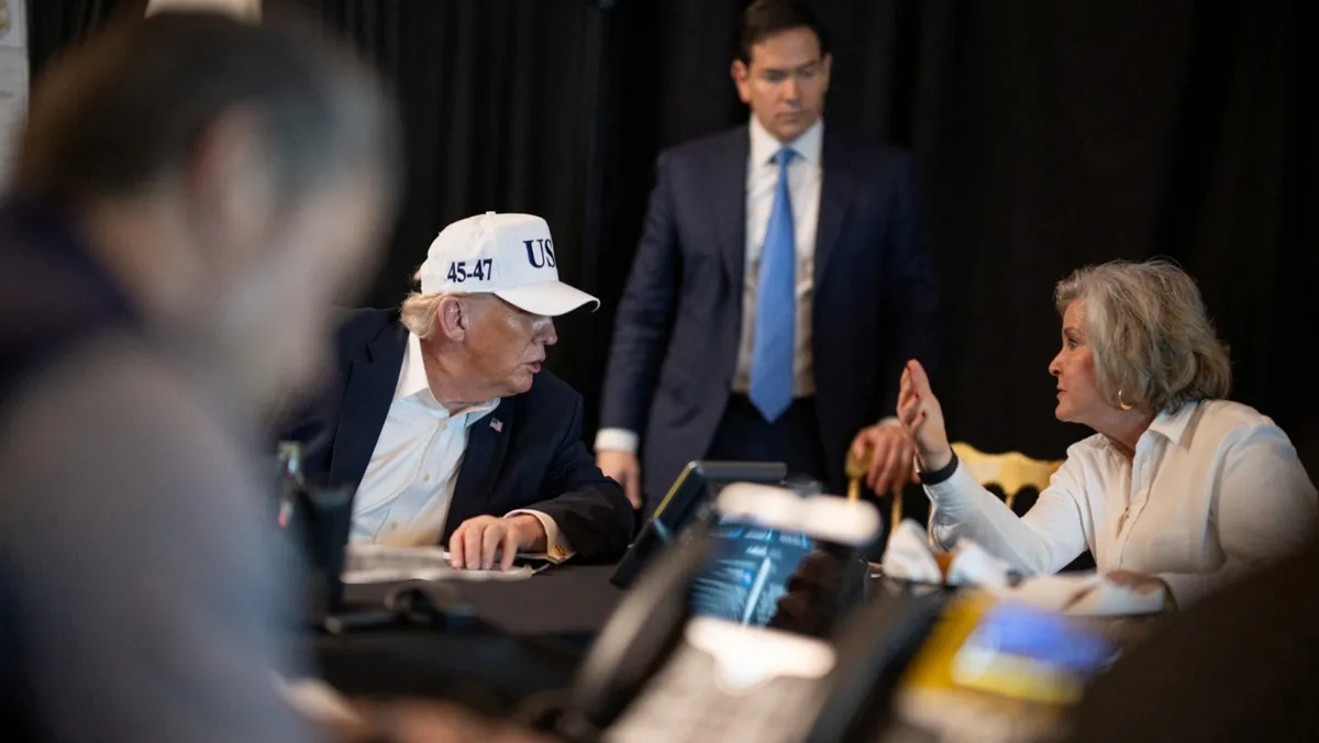 الرئيس الأميركي دونالد ترمب يتحدث مع رئيسة موظفي البيت الأبيض سوزي وايلز ووزير الخارجية ماركو روبيو خلال العمليات العسكرية في إيران، منتجع مارالاجو بولاية فلوريدا. 28 فبراير 2026 - REUTERS