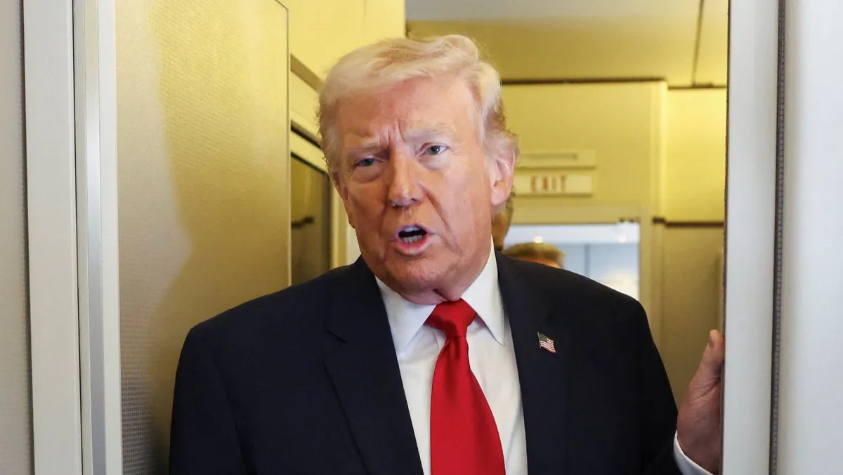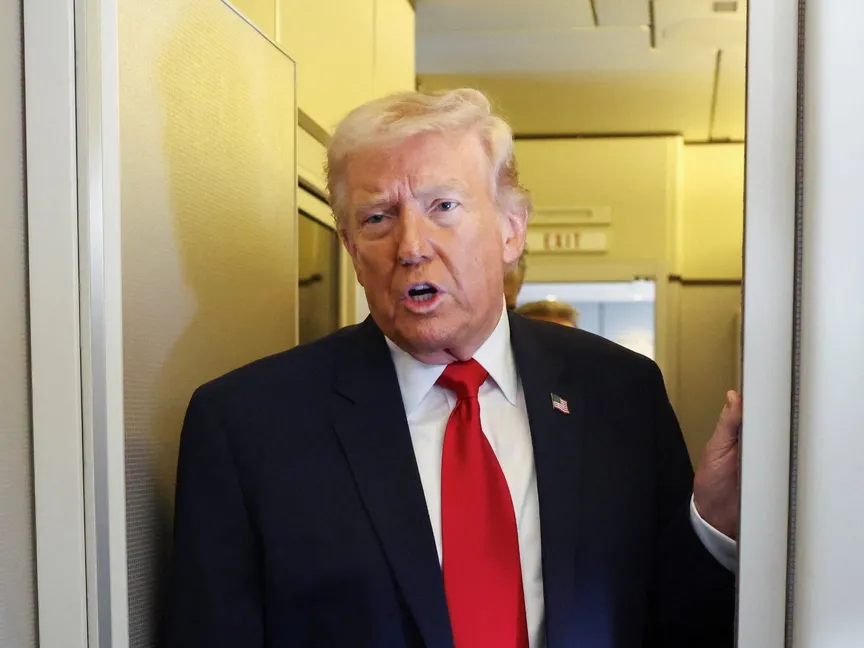 الرئيس الأميركي دونالد ترمب يتحدث إلى الصحافيين على متن الطائرة الرئاسية (Air Force One) أثناء رحلة من دوفر بولاية ديلاوير إلى ميامي بولاية فلوريدا. 7 مارس 2026 - REUTERS