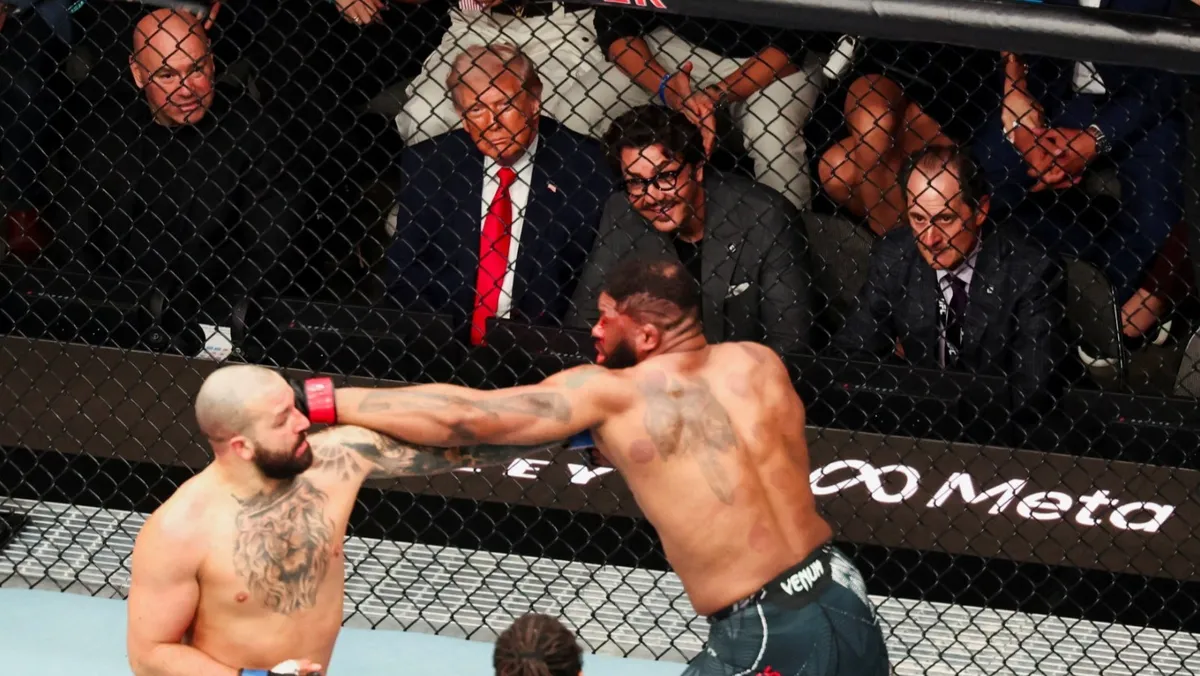 وفي اللحظة التي بدأ فيها فانس بتقديم إحاطة إعلامية في باكستان، كان ترمب واقفاً بلا حراك بجانب الحلبة ويداه إلى جانبيه، بينما كان أحد المقاتلين المنتصرين يهتف.
