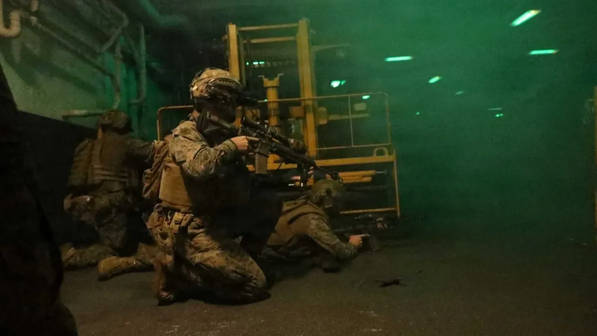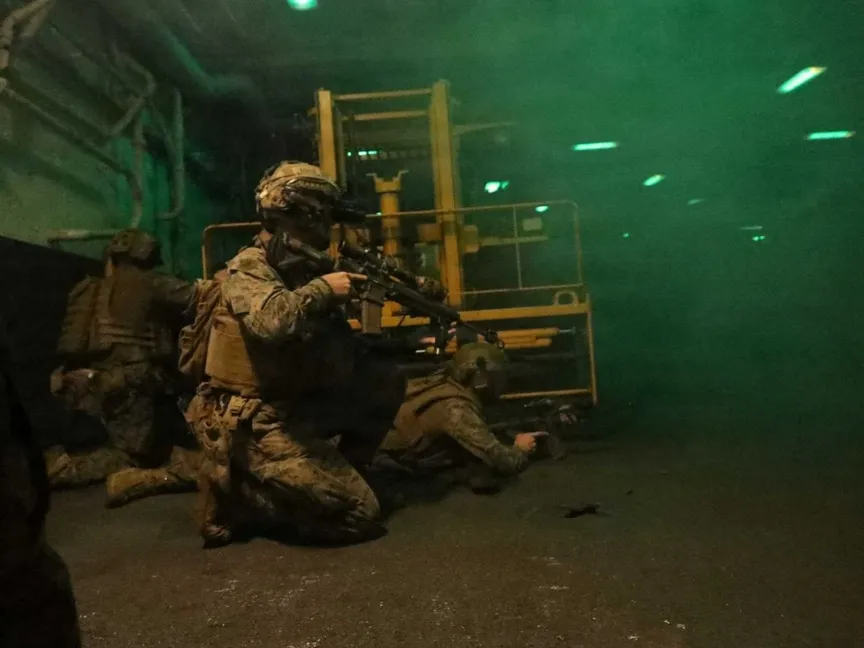 نشرت القيادة المركزية الأميركية (سنتكوم)، صوراً قالت إنها لمشاة البحرية الأميركية (المارينز) وهم يقومون بتدريبات تكتيكات القتال عن قرب (معارك المسافة صفر)، على متن سفينة الهجوم البرمائي USS Tripoli خلال إبحارها في بحر العرب، وذلك، وسط عملية بحرية كبرى لحصار الموانئ الإيرانية.