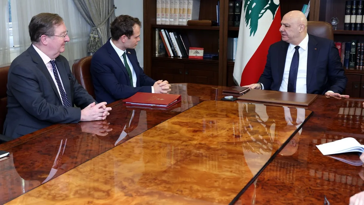 وقالت الرئاسة اللبنانية في بيانها إن الوزير البريطاني أبلغ عون دعم بلاده للجهود التي يقوم بها من أجل وقف اطلاق النار وإطلاق مسار تفاوضي يحقق الأهداف التي حددها رئيس الجمهورية في مبادرته التفاوضية.
